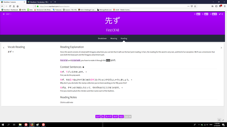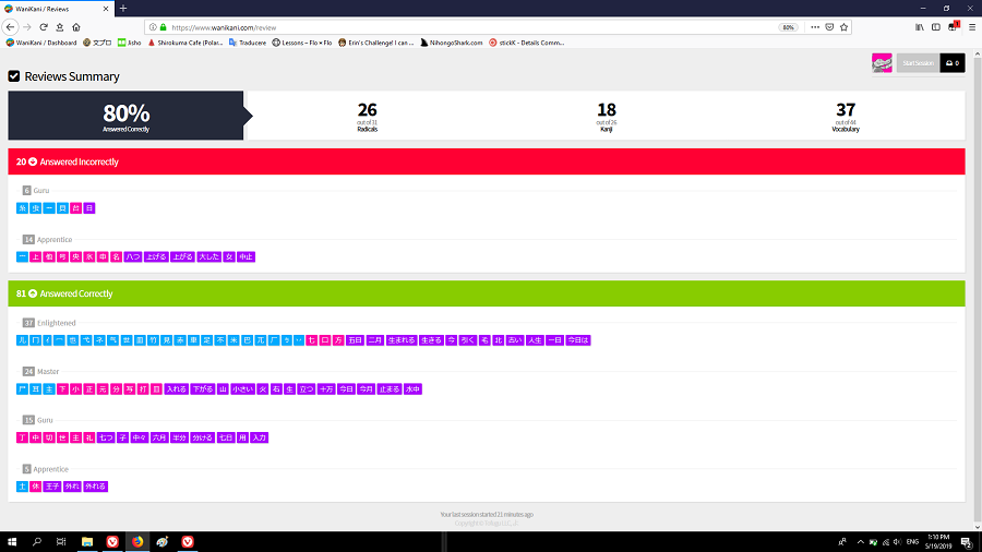 13:10 Termin toate review-urile. Sunt chiar incantat cu rezultatul. Sunt surprins ca am retinut citirile la Kanji. Cateodata ajung sa ma indoiesc si eu de metoda aceasta folosind mnemonics, dar in momente ca si acestea imi amintesc cat de true to the bone sunt (adica functioneaza!).