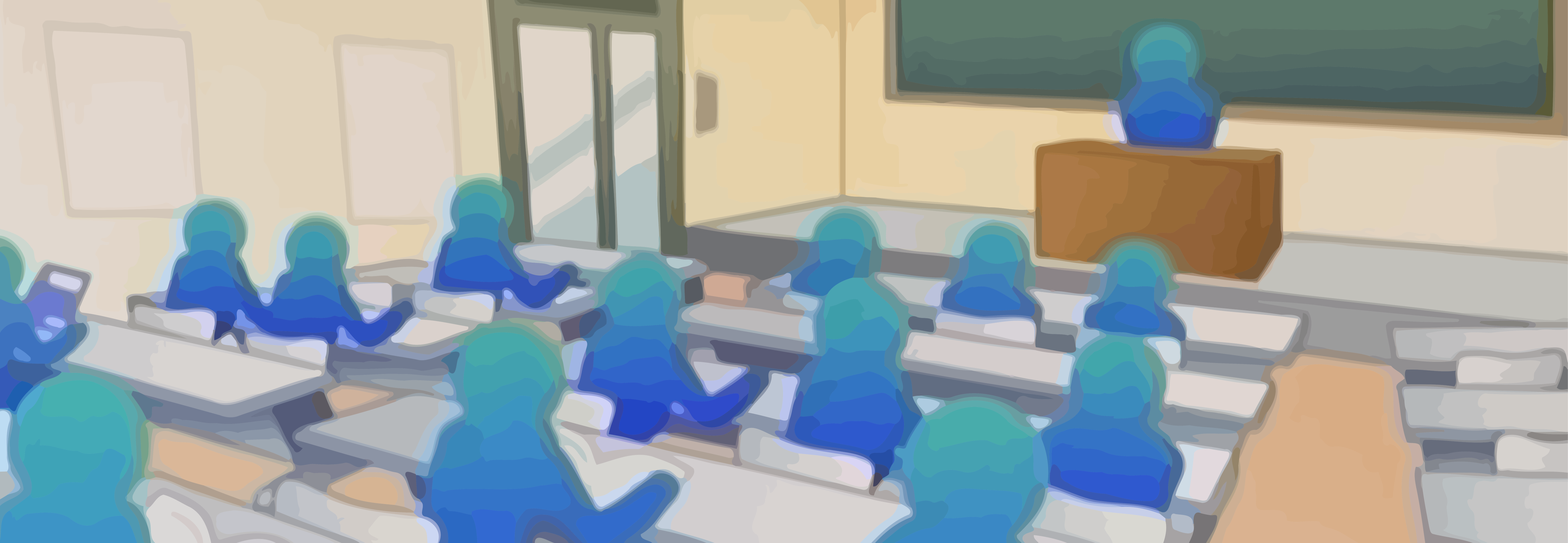 Koko wa ōkii kyōshitsu. Nihyaku-nin no gakusē ga jugyō o uketeiru yo.