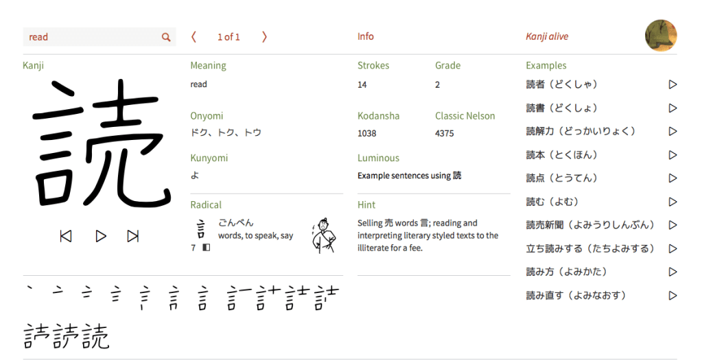 Ce îmi place foarte mult la KanjiAlive este că are suport pentru anumite manuale de kanji (cum ar fi și Basic Kanji Book sau Genki) și că poți căuta acei kanji predați în capitole anumite din carte (de exemplu, pentru Basic Kanji Book introduci text:bk:c1 în bara de search și primești toate caracterele din primul capitol).
