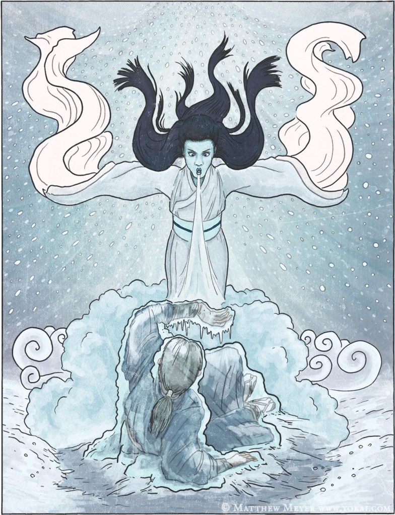 - Yuki-onna este o fantomă asociată cu peisajele înzăpezite. Ea este adesea descrisă ca o femeie frumoasă, îmbrăcată în alb, care poate îngheța călătorii până la moarte cu respirația ei.